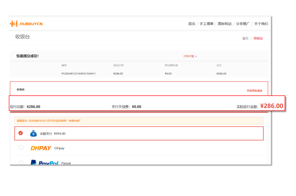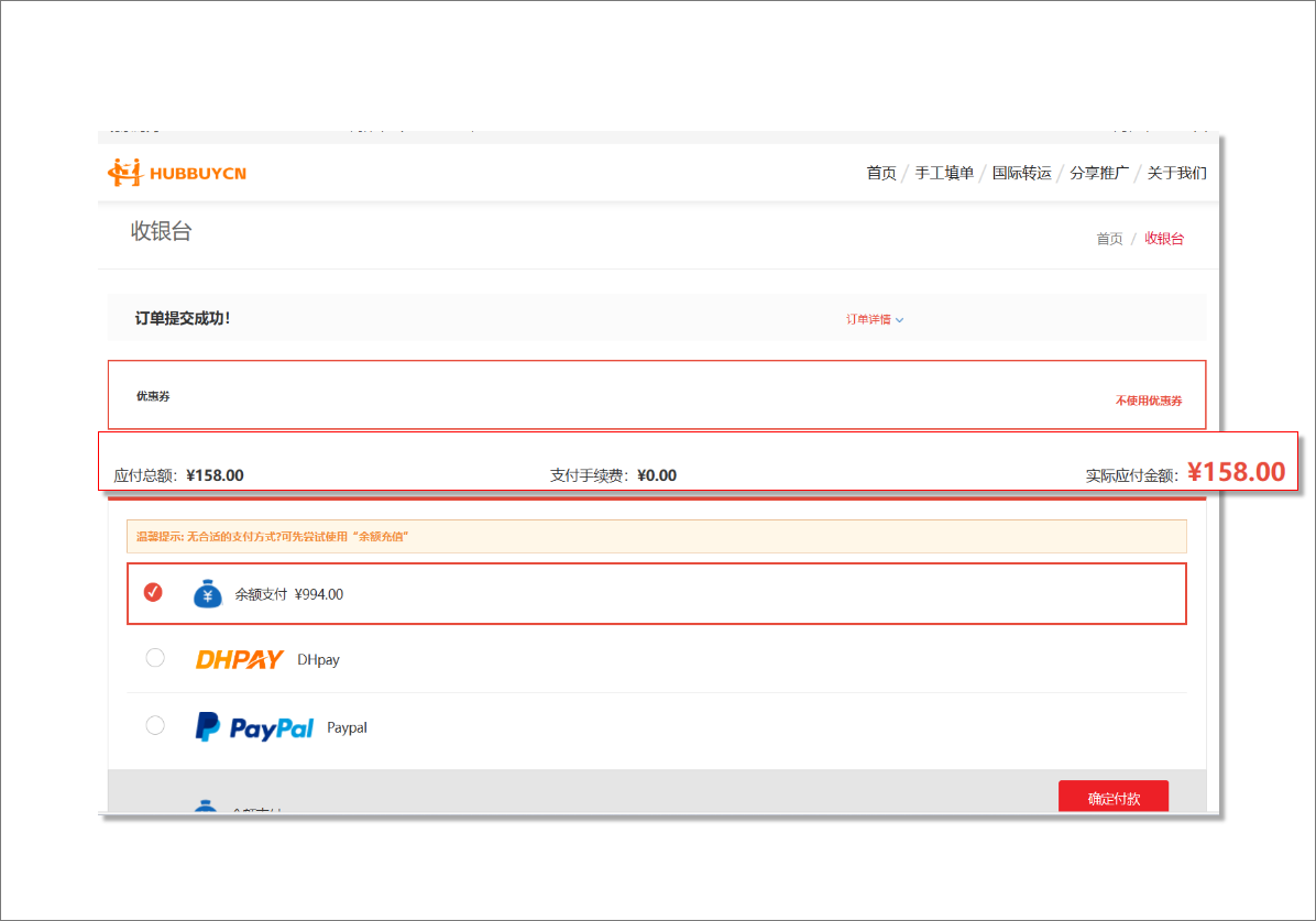 提交代购的商品订单支付商品费用