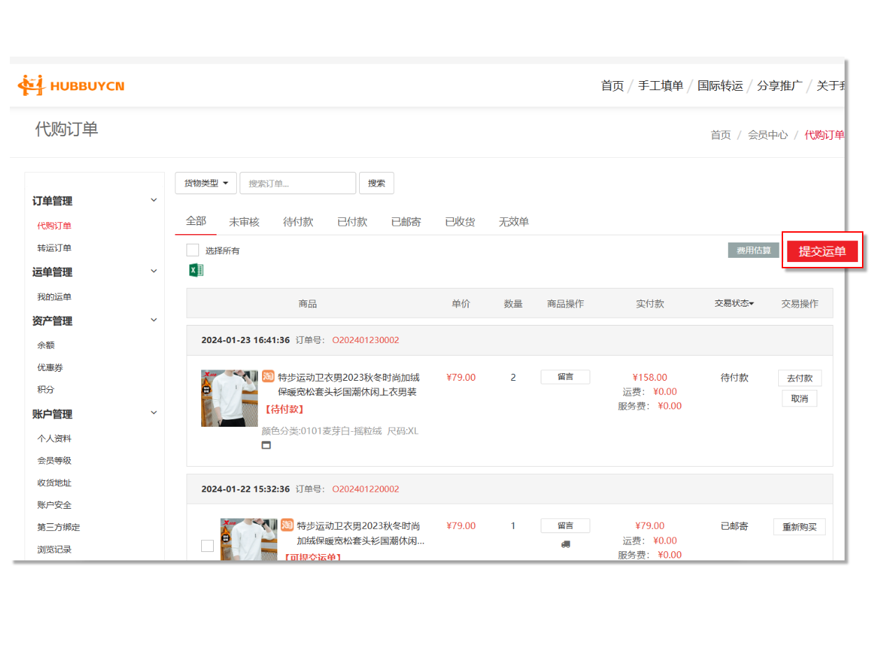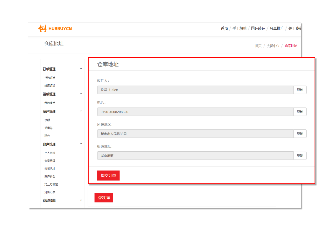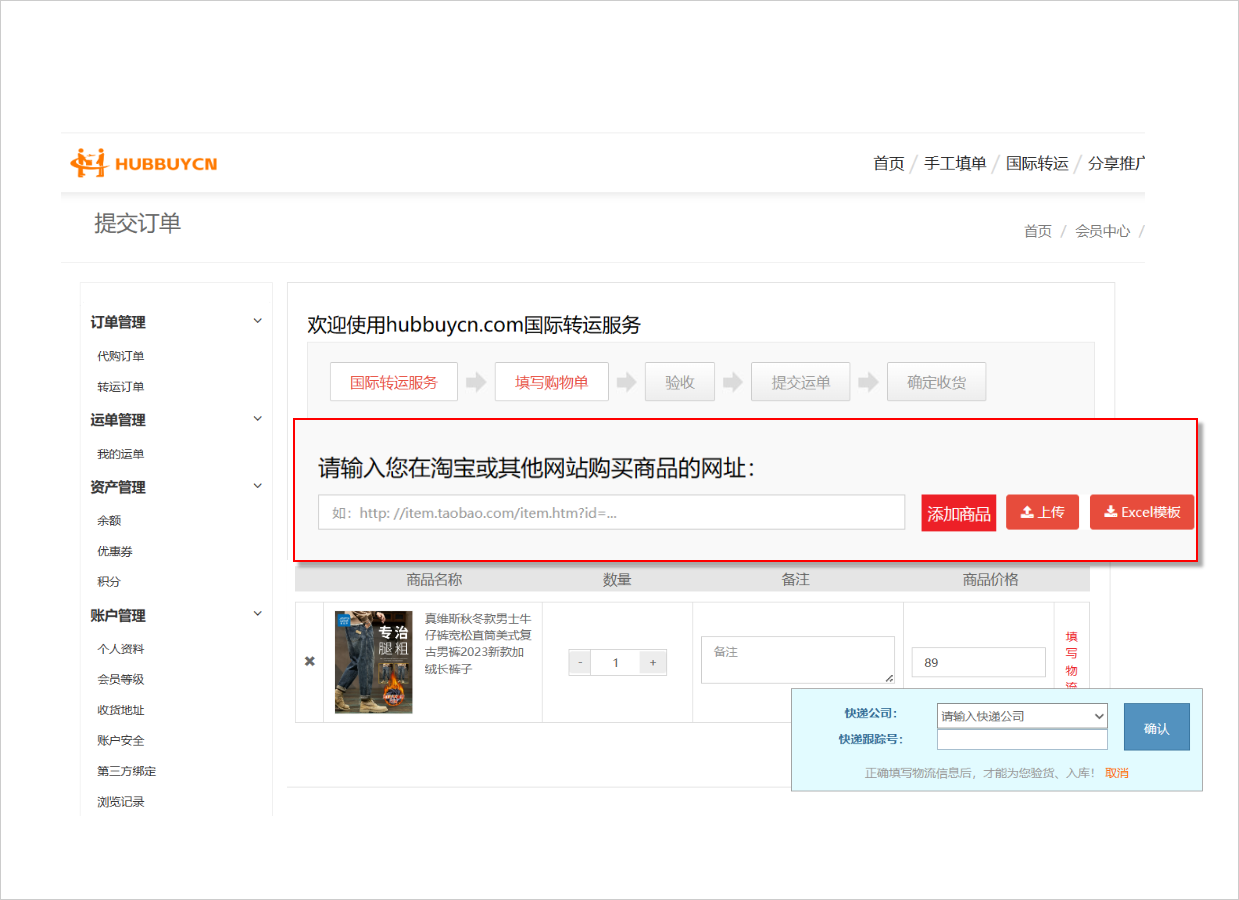 或者通过国际转运填写商品信息直接提交订单到HubbuyCN平台,会员登录后在“会员中心”—“仓库地址”中获取转运地址(此地址信息为您在淘宝、京东等电商平台下单时填写的收件地址信息),点击“提交订单”然后在HubbuyCN平台填写您购买的商品信息后提交即可!